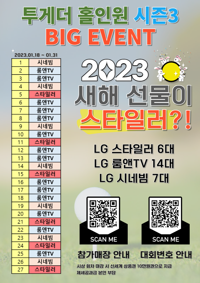 신년을 맞이하여 더욱 빠르게 , 더욱 큰 혜택을 드리고자 잔여 홀인원 수와 시상품에 대한 변경건에 대한 안내를 드립니다.